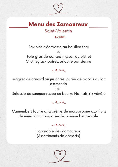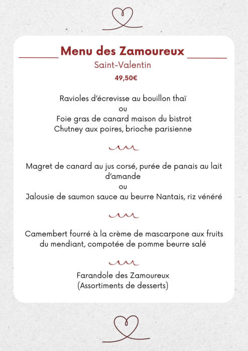 ACCUEIL TÉLÉPHONIQUE POUR RÉSERVATIONDE 11H00 À 14H00 ET DE 18H00 À 20H00……………………………………………………………FERMETURES LE DIMANCHE SOIR - LE LUNDI TOUTE LA JOURNÉELE MERCREDI SOIR……………………………………………………………CHÈQUES ET CHÈQUES VACANCES NON ACCEPTÉS CARTES TICKET RESTAURANT ACCEPTÉESUNIQUEMENT DU MARDI AU VENDREDI PRIX NETS EN EUROS, TAXES ET SERVICE COMPRIS